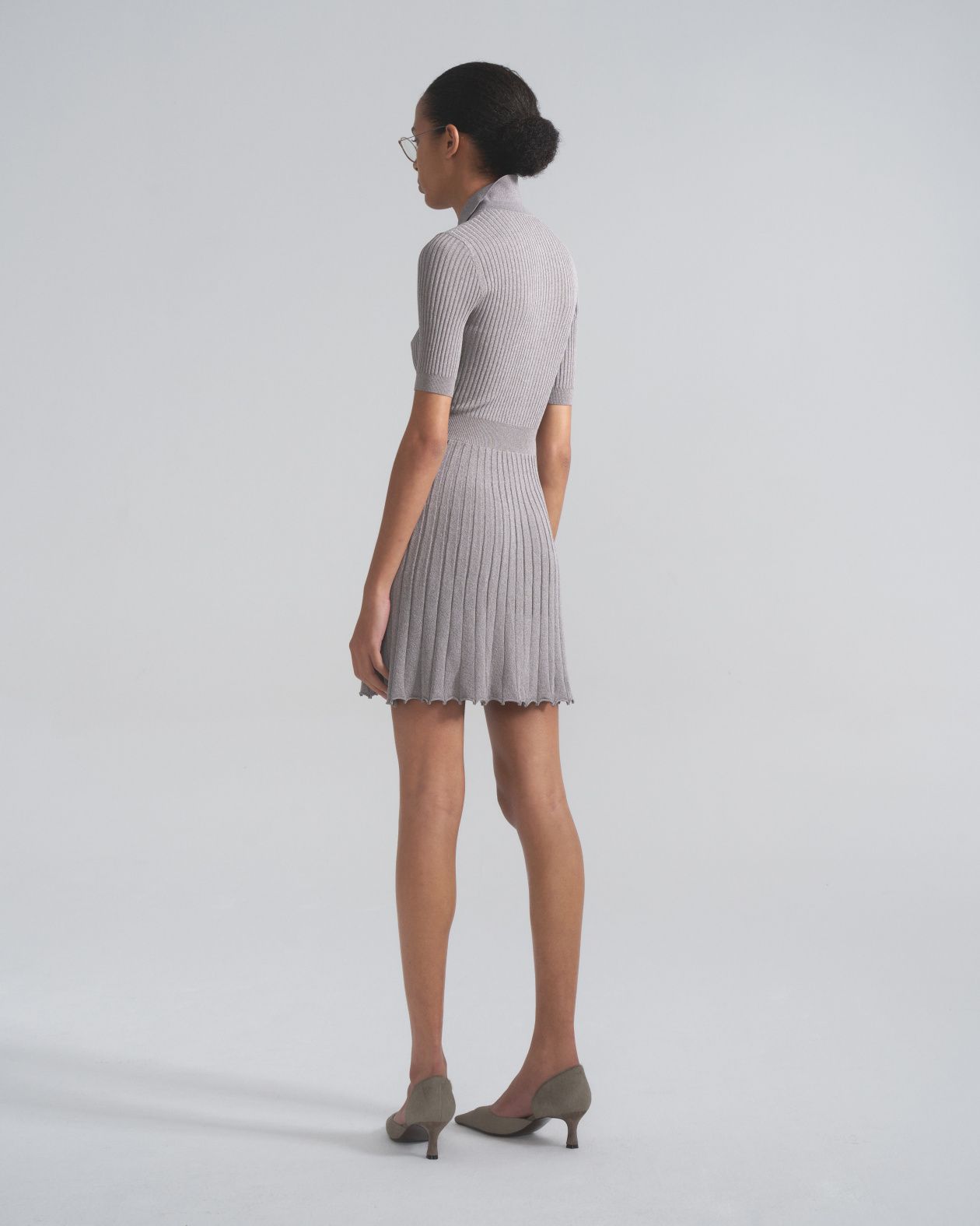 A fitted knit mini dress with a 6-button closure, polo collar, short sleeves, and a pleated skirt.Composition: 85% viscose, 15% nylon