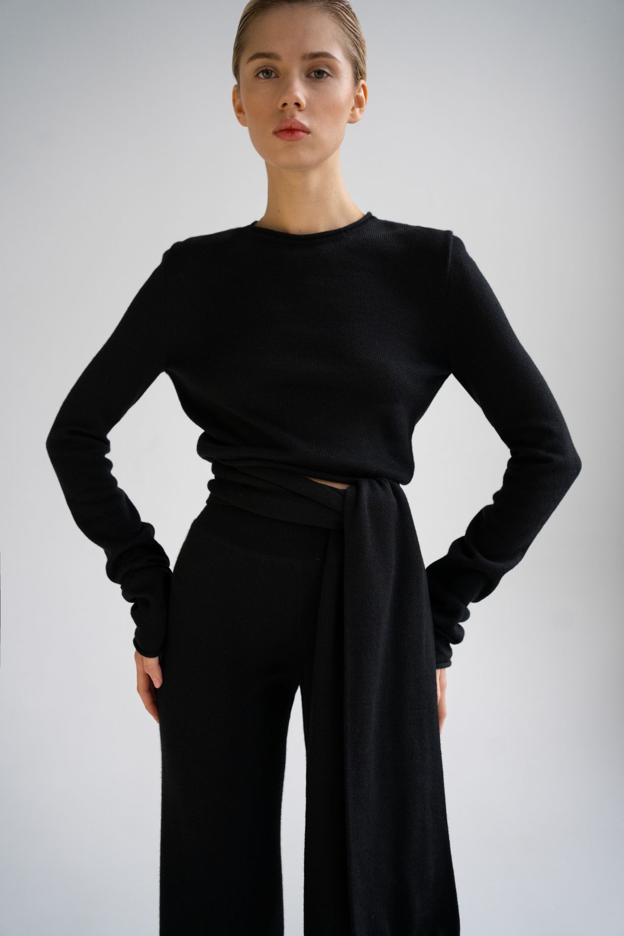 Knitted sweater with a wide scarf belt around the waist made of Australian merino wool.Composition: 60% Australian merino wool, 40% Viscose