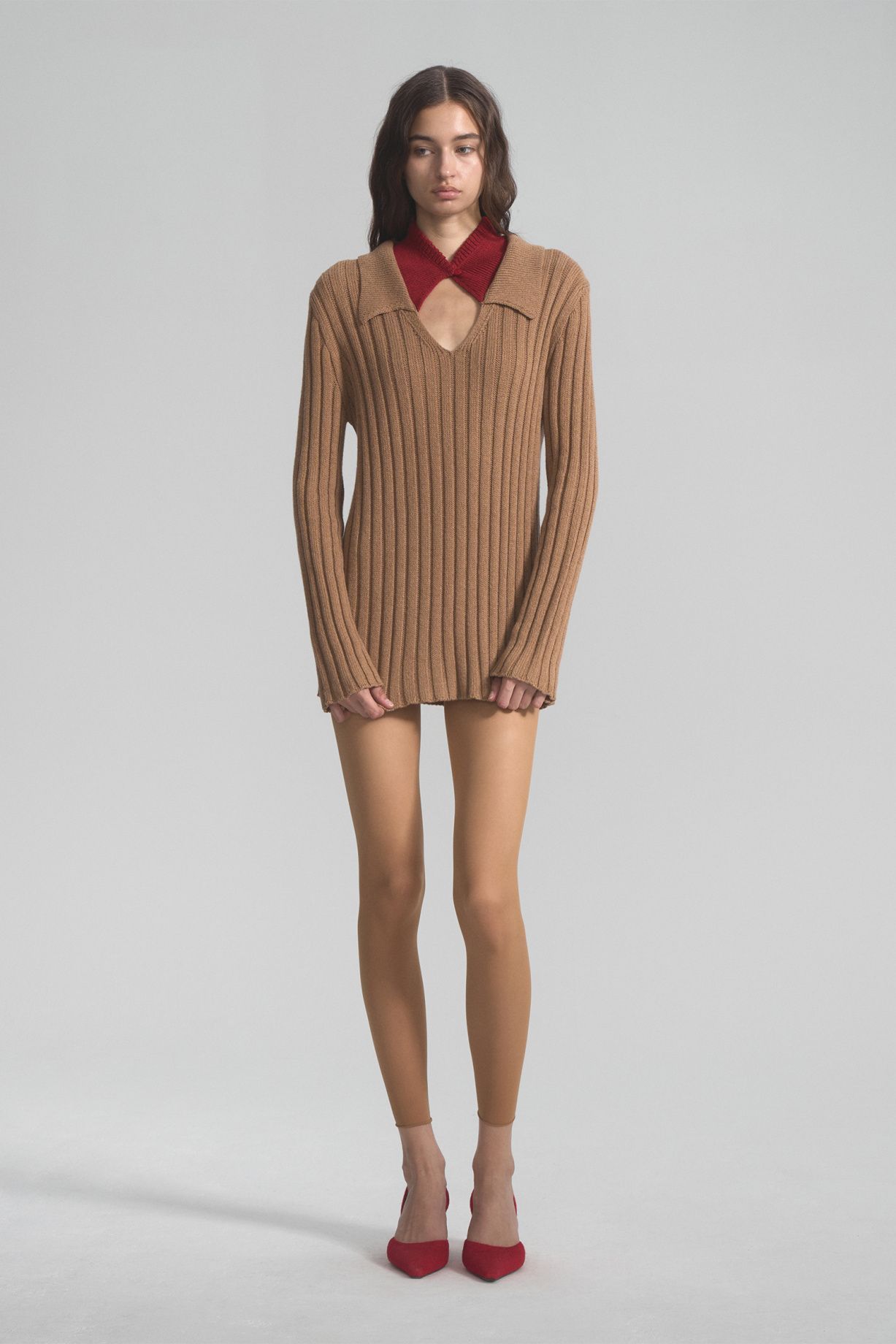 A sweater made of cashmere and Peruvian cotton in large ribbing, with a contrasting collar, a straight silhouette, with a soft shoulder line, smooth long sleeves and a neck decorated with a classic V-neckComposition: 50% cashmere, 50% cotton