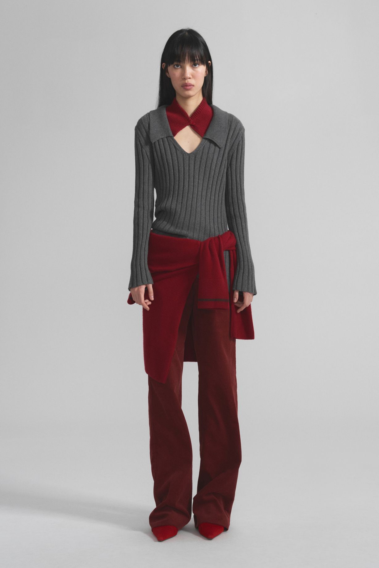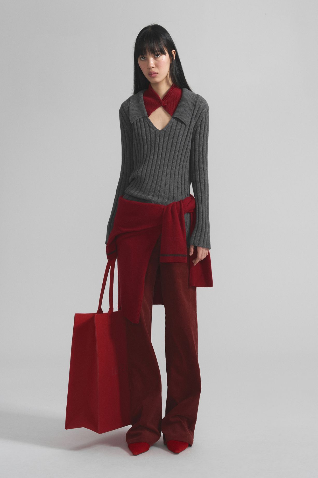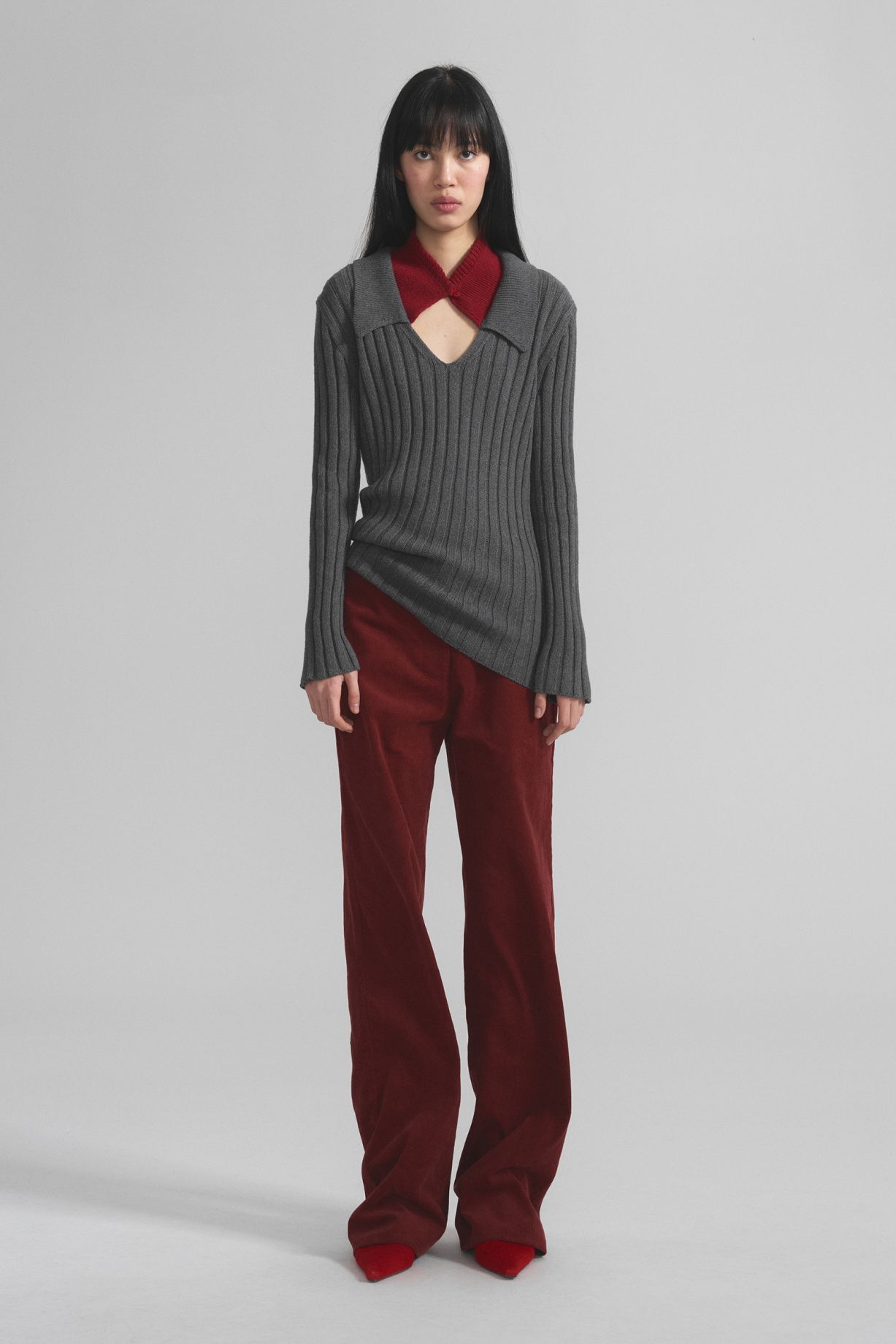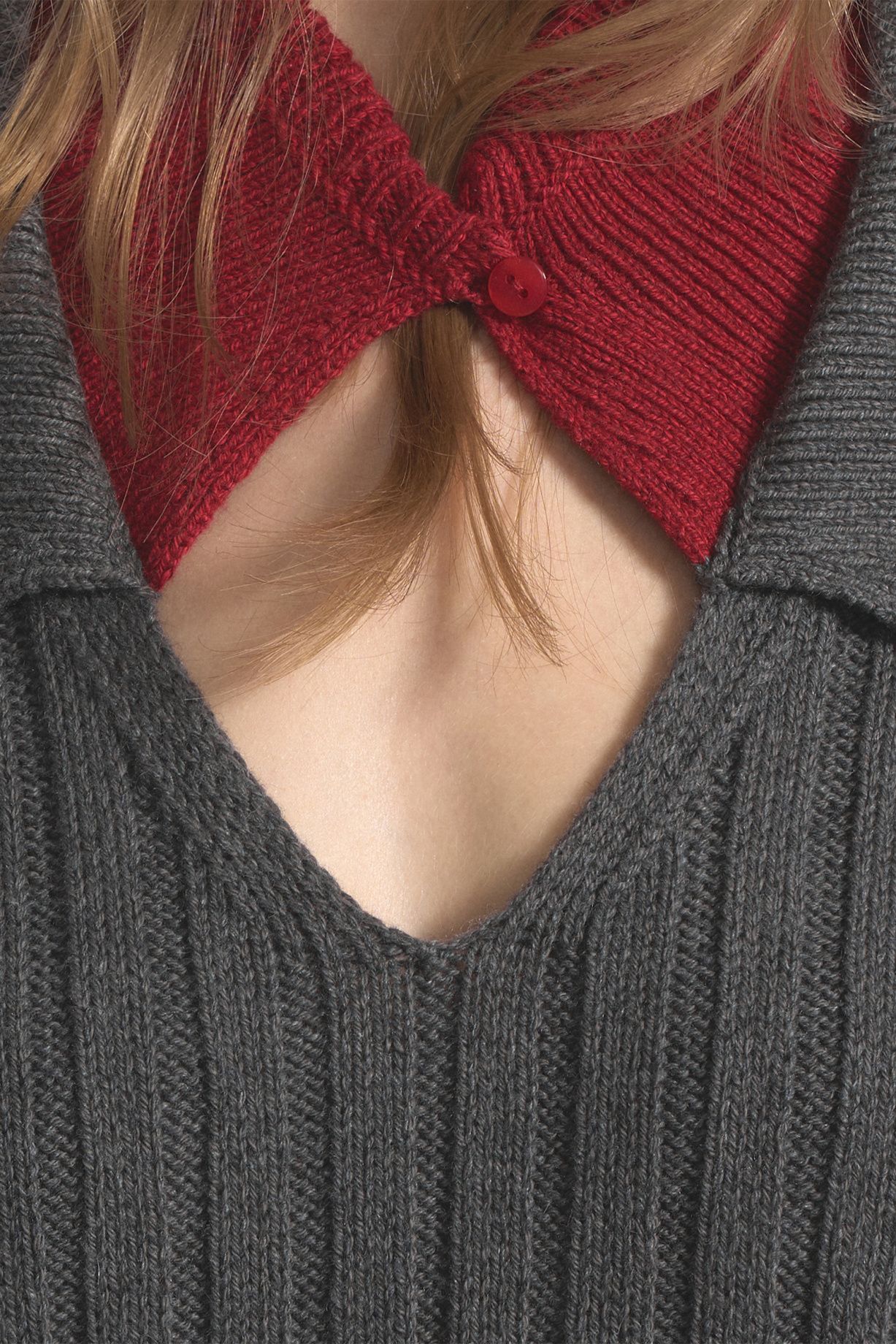 A sweater made of cashmere and Peruvian cotton in large ribbing, with a contrasting collar, a straight silhouette, with a soft shoulder line, smooth long sleeves and a neck decorated with a classic V-neckComposition: 50% cashmere, 50% cotton