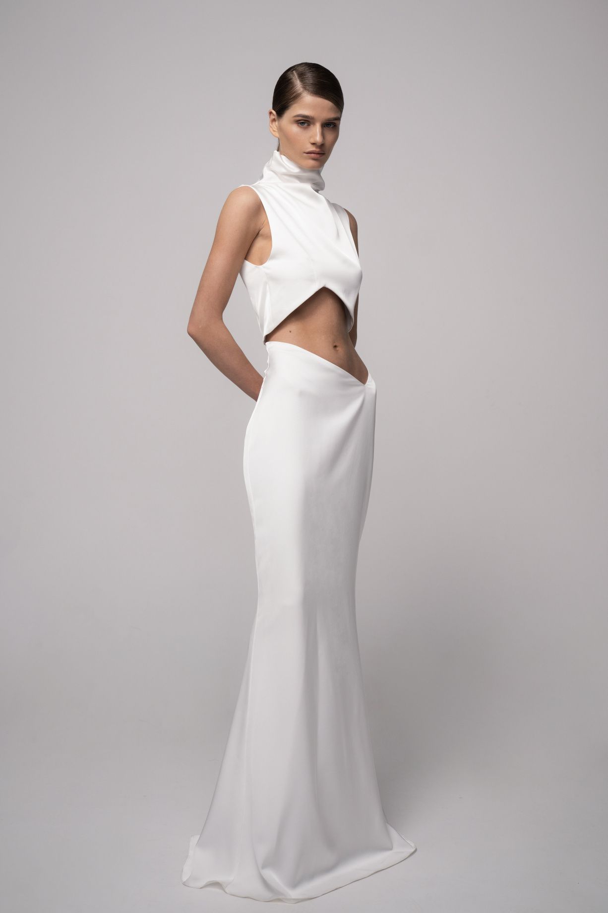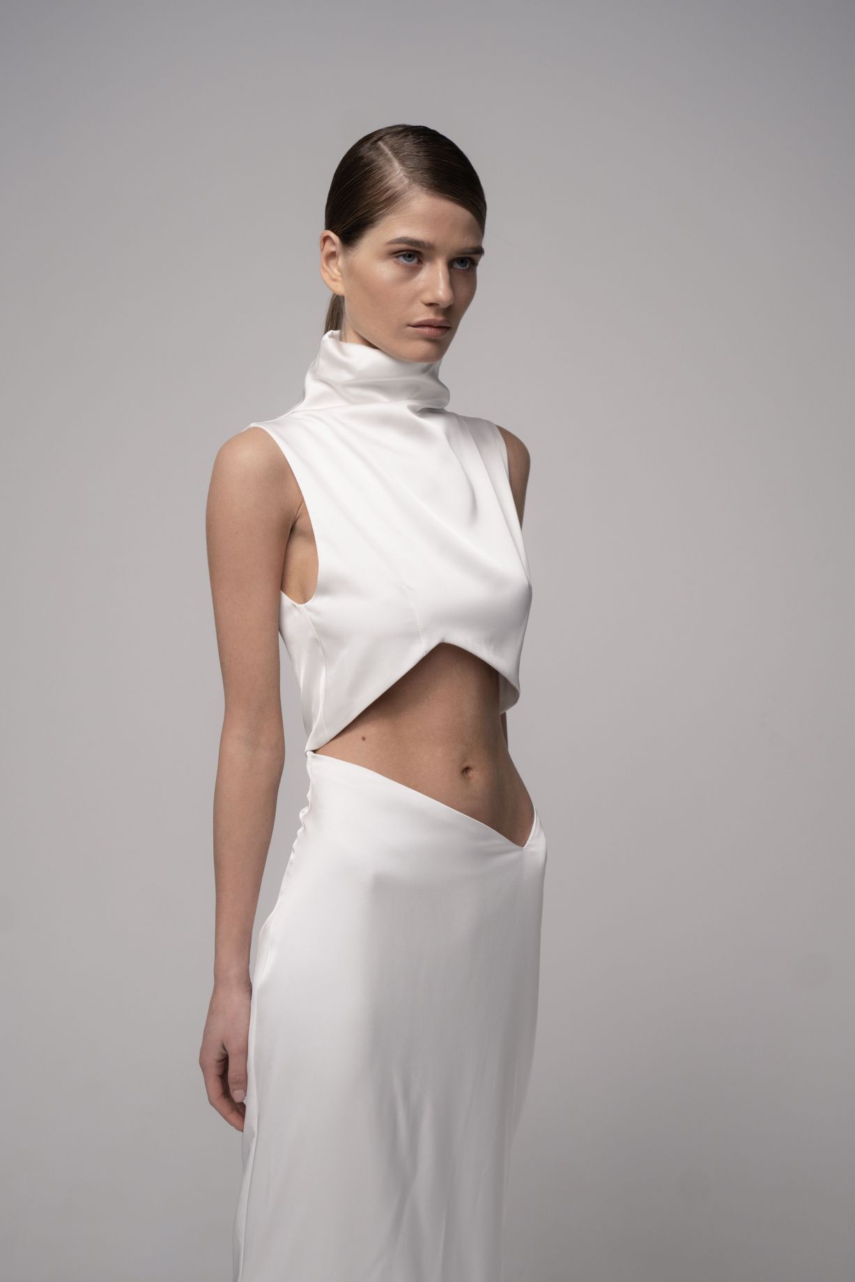 Silk adds shine and luxury, while viscose provides softness and drape, creating an elegant and sophisticated look. The high neck and asymmetrical cut emphasize the silhouette and give the look a unique and feminine touch. Has a zip fastening.Composition: 70% viscose, 30% silk