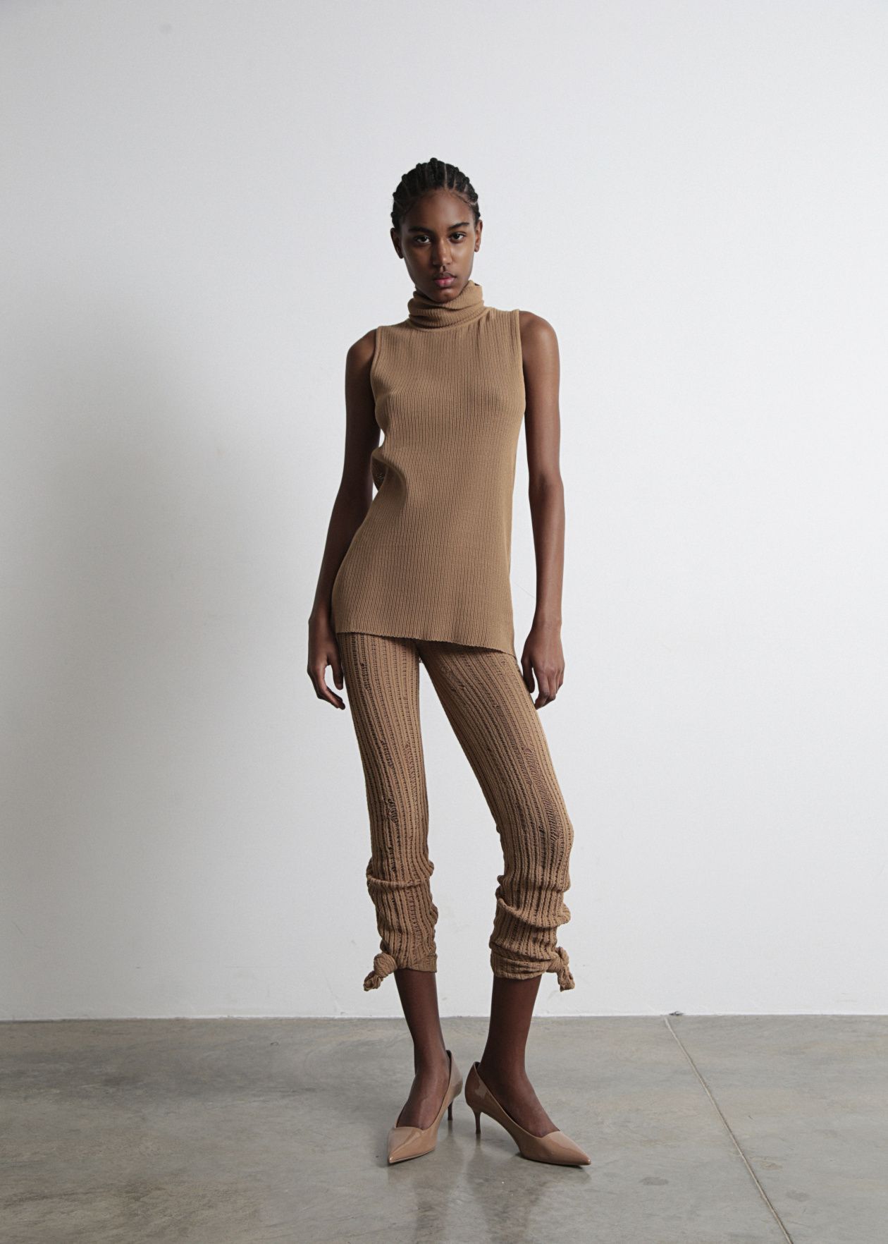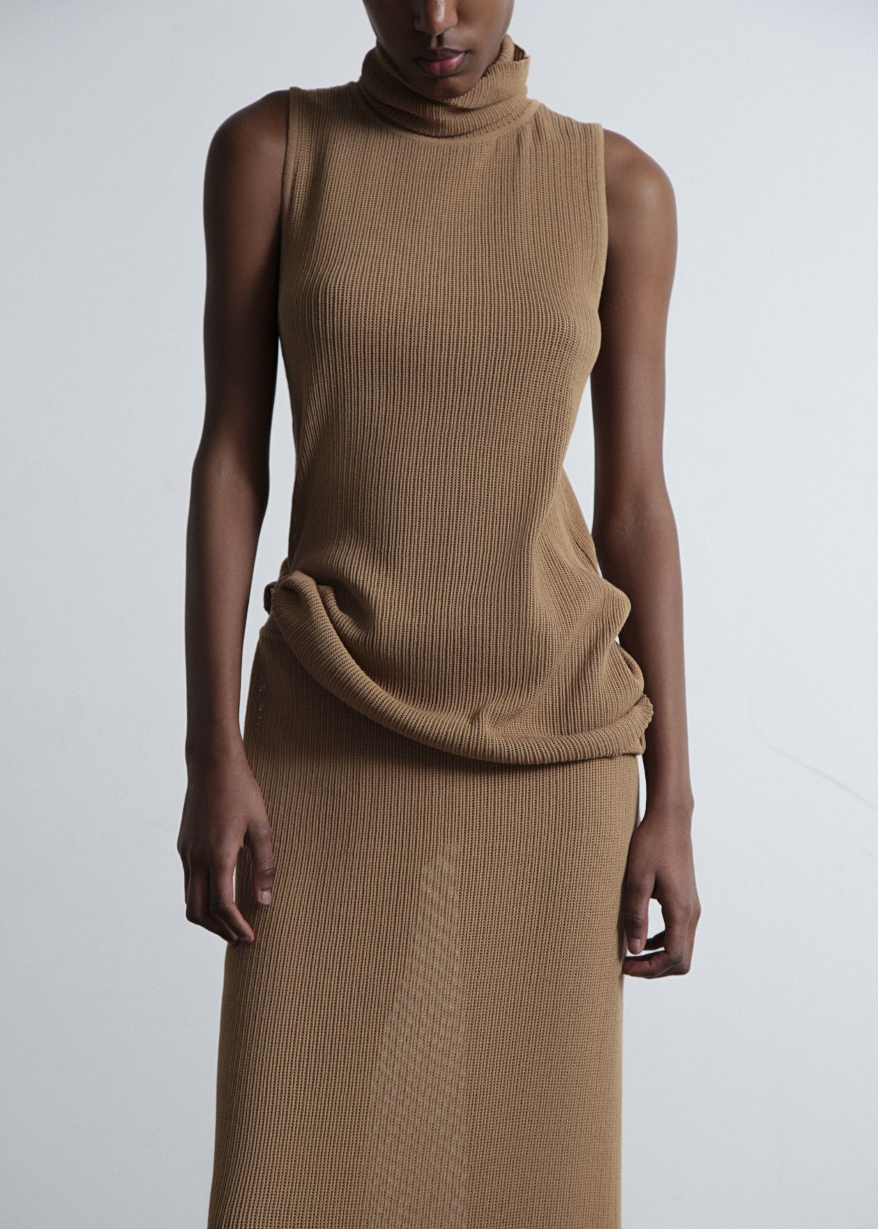 Turtleneck sweater with a high collar made of soft Italian yarn without sleeves.Composition: 91% viscose, 9% elastane