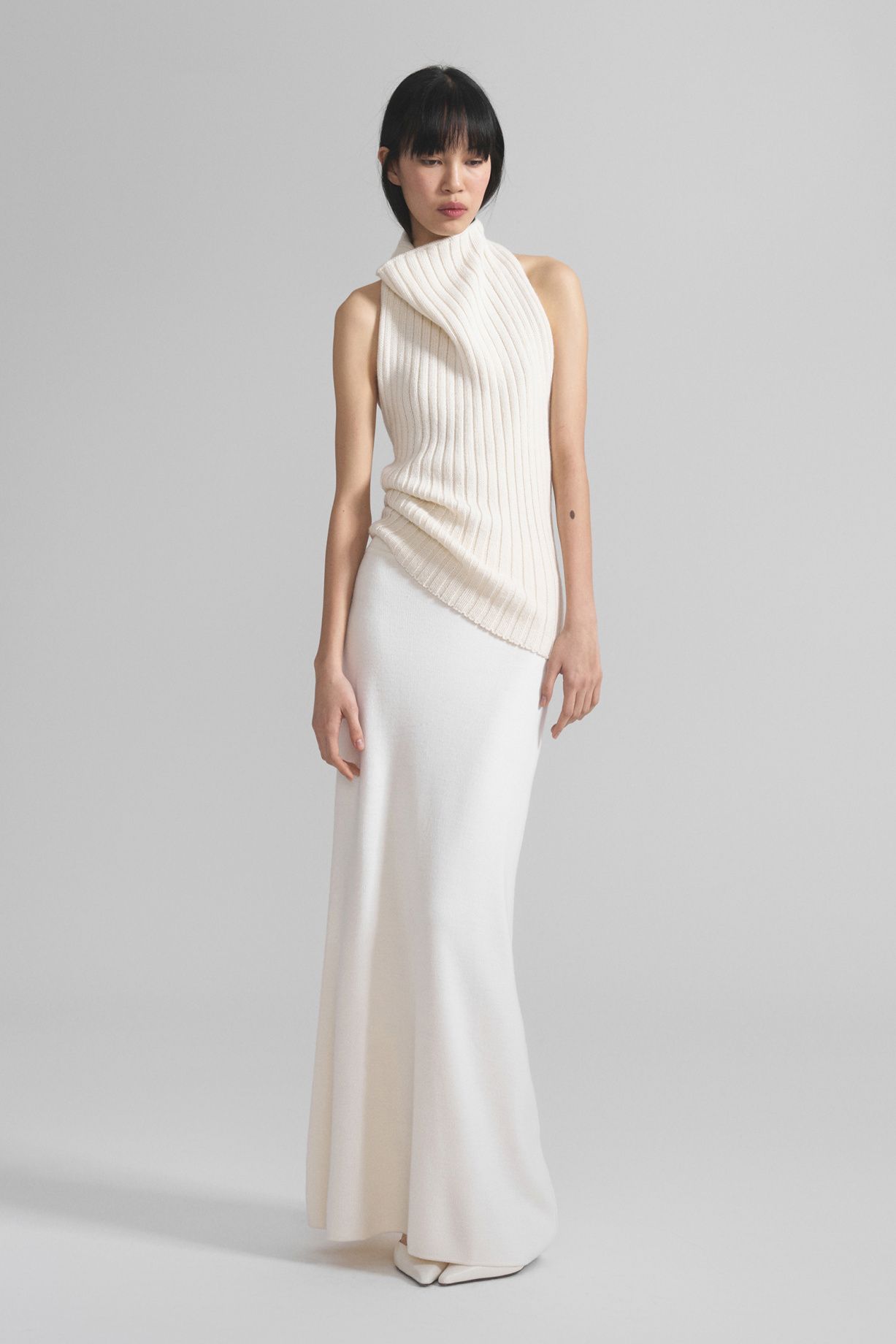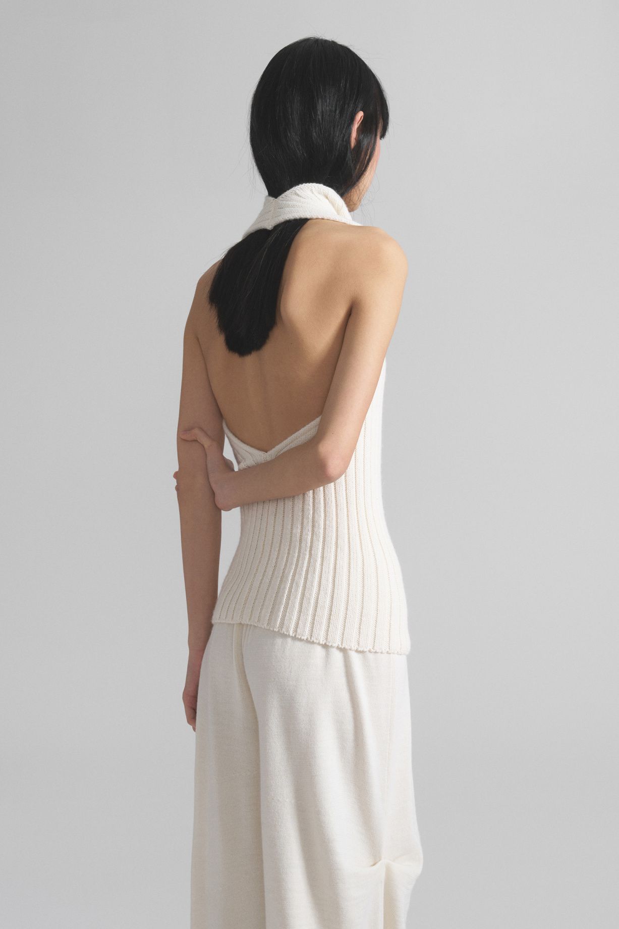 A one-piece viscose and wool top with a solid stand-up collar. Main weave: 2x2 rib