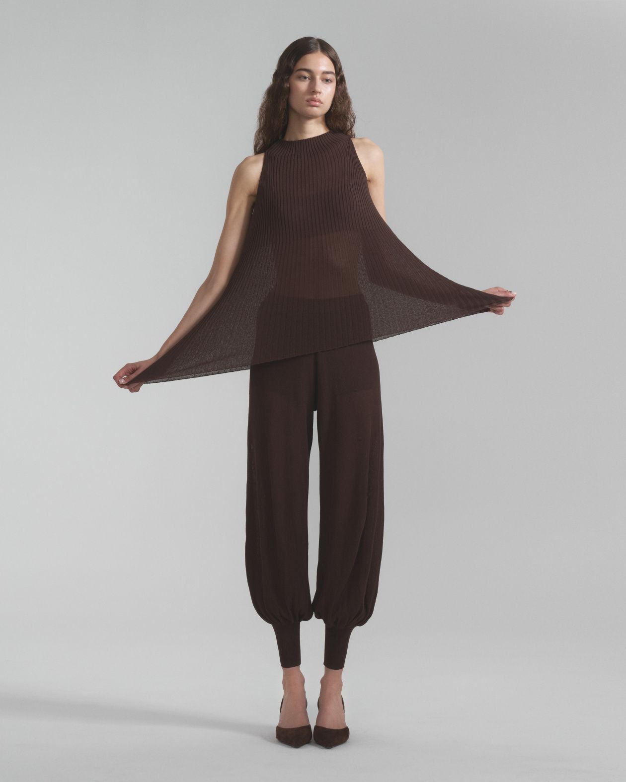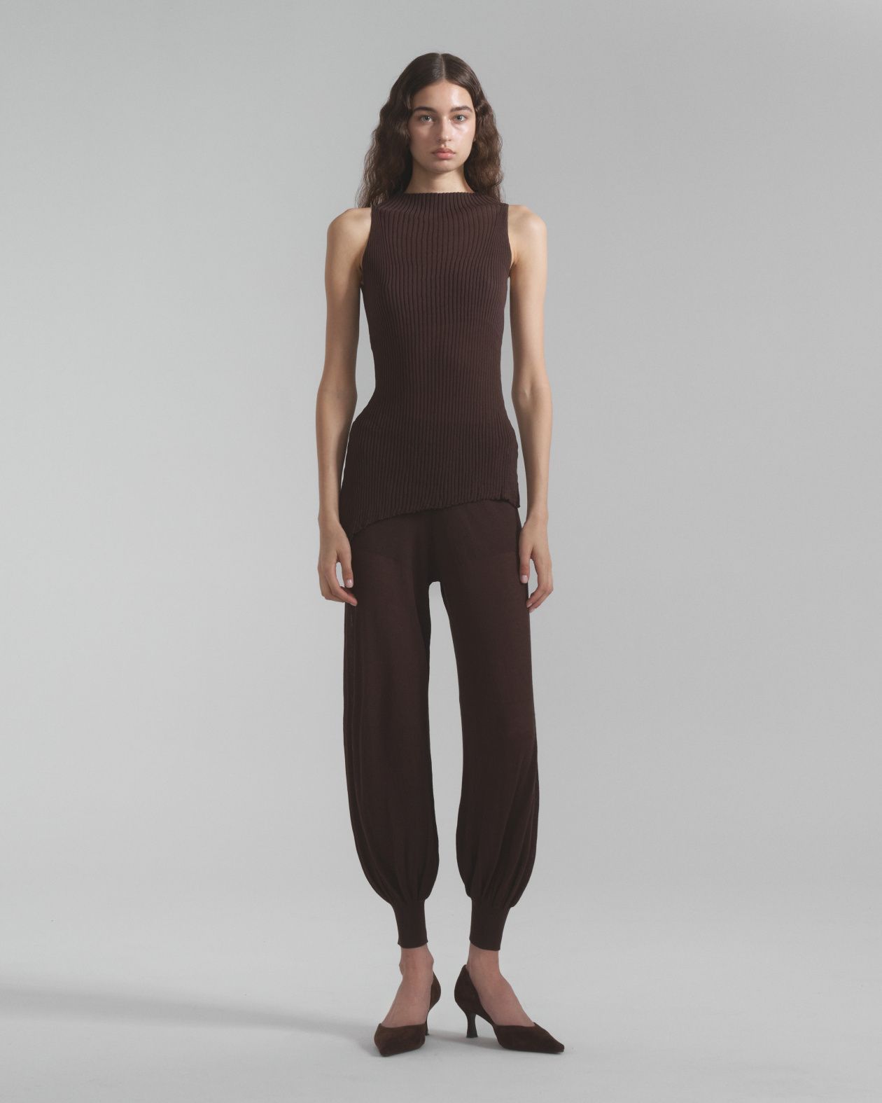 Fitted top with an asymmetrical hemline, round knitted neckline, sleeveless.Composition: 75% cotton, 25% nylon