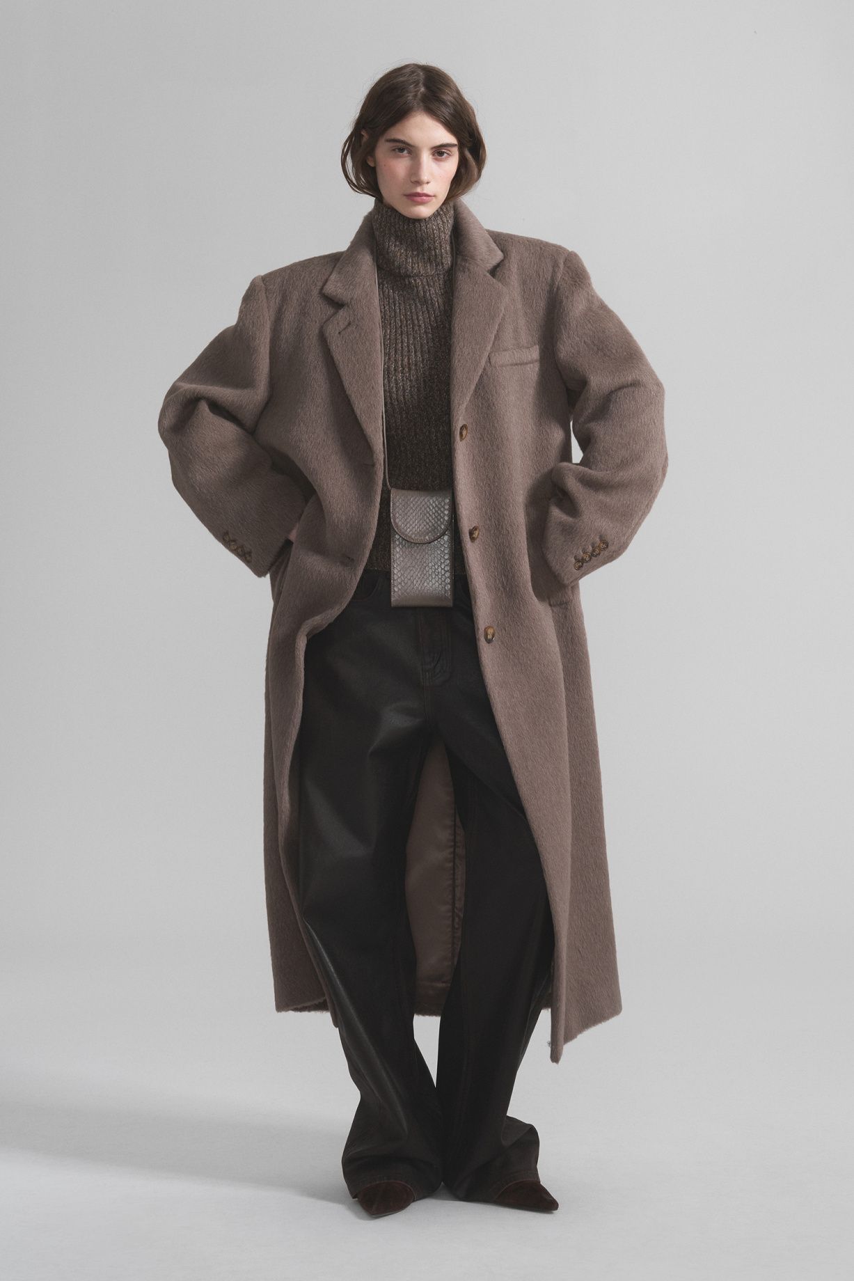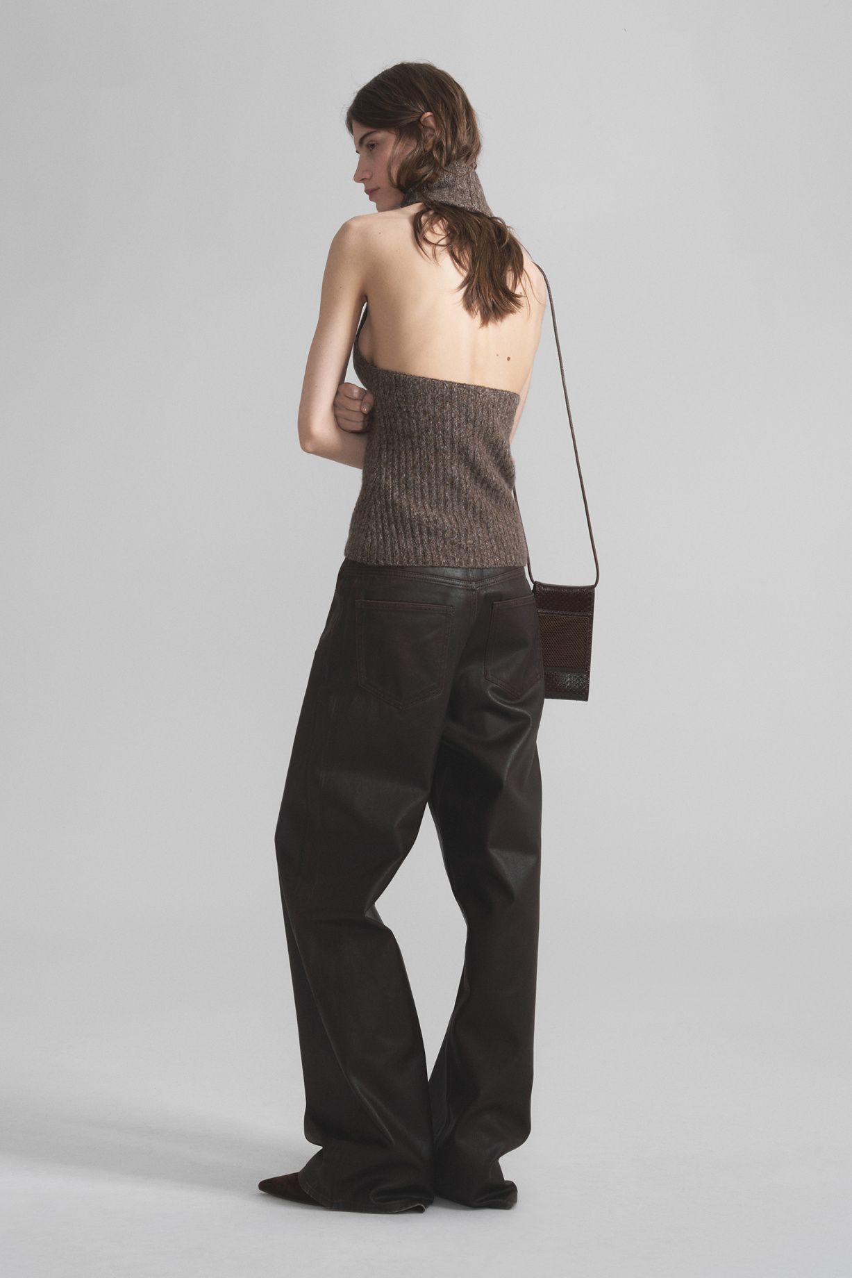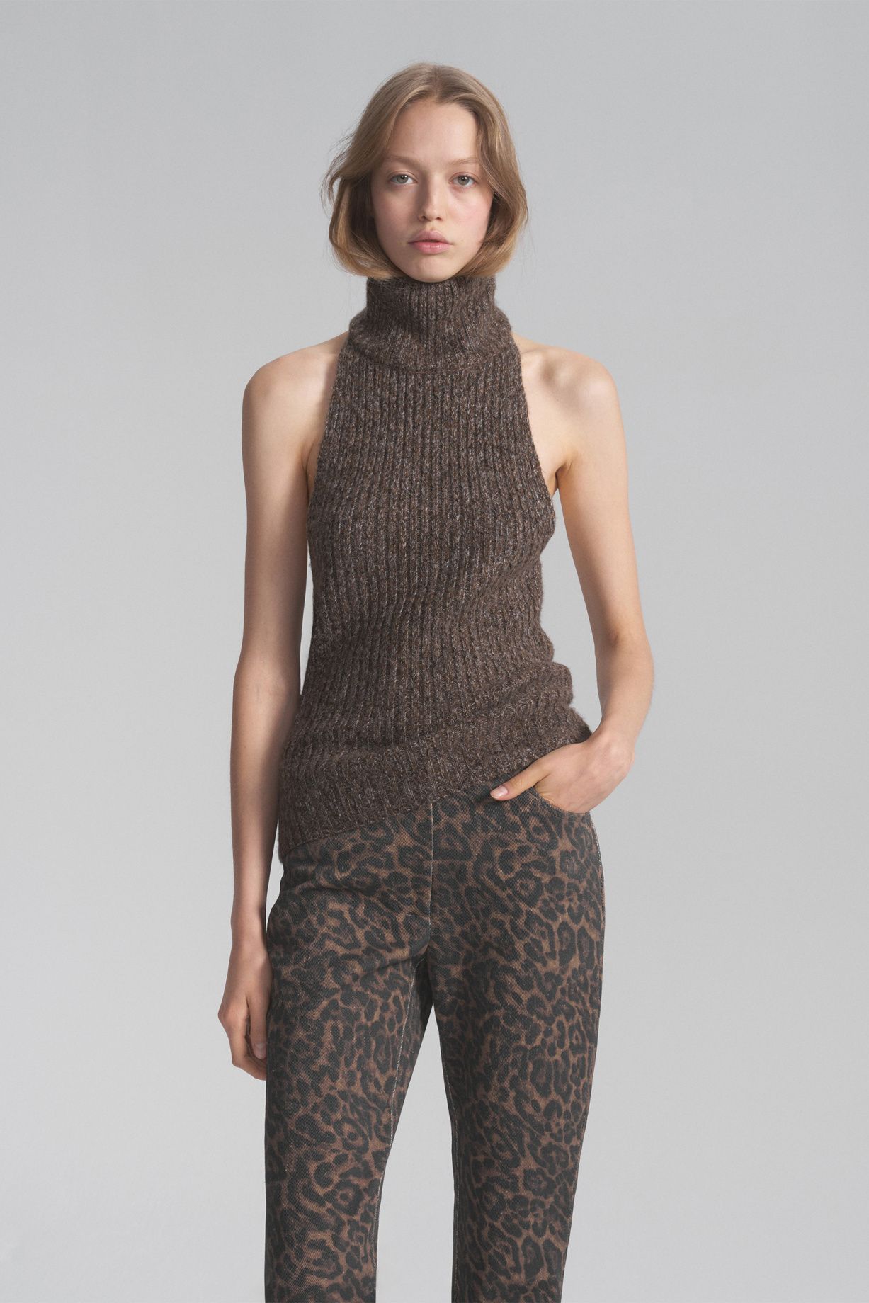 This top is crafted from soft, warm alpaca wool, comfortably clinging to the body. Its elongated shape, high double collar, and open back create a simple yet expressive accent. The melange yarn creates a deep, elegant hue, making it a versatile staple for any season.Composition: 30% alpaca, 60% wool, 10% nylon