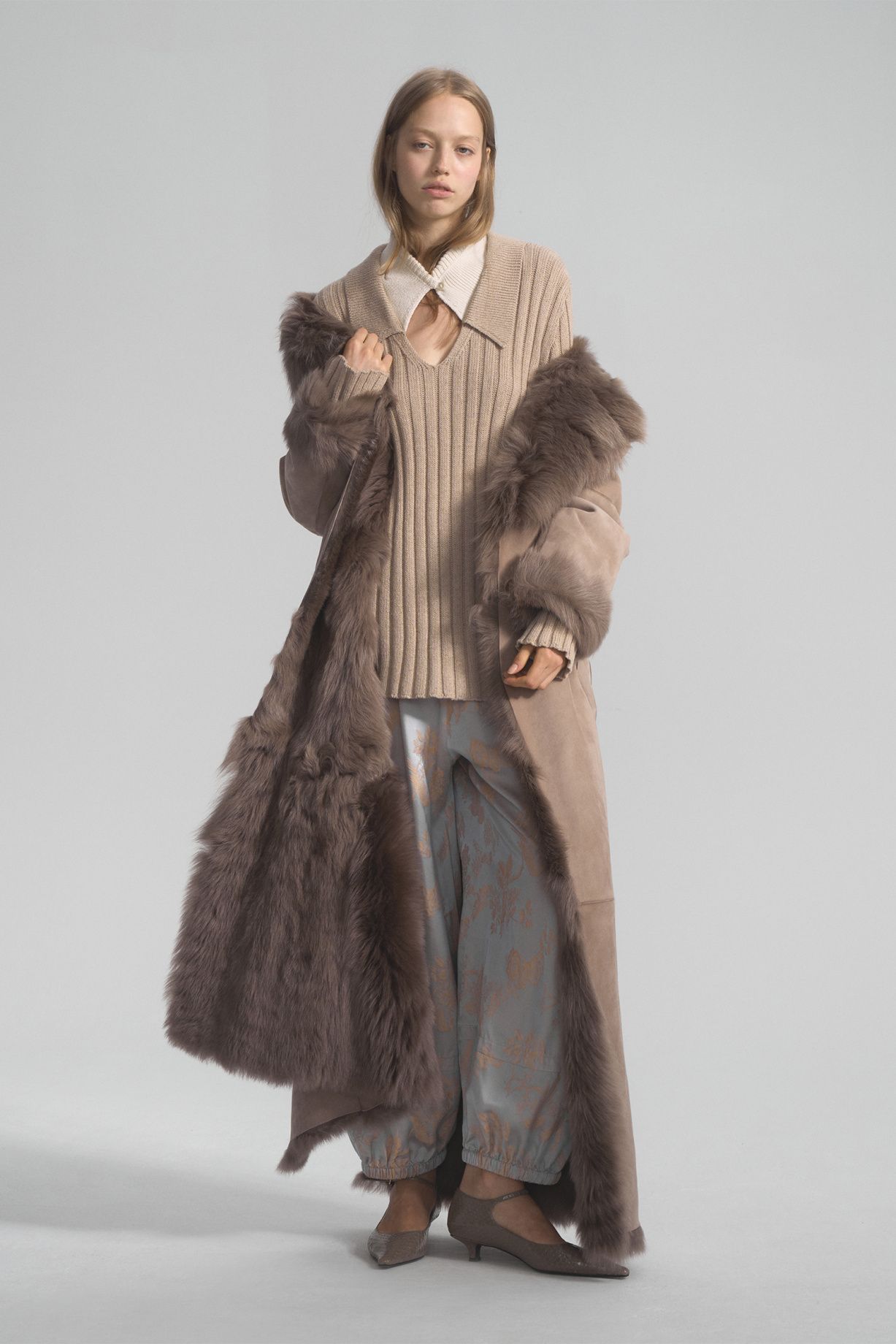 Sheepskin coat made of natural Tuscan sheepskin in etoupe color. Maxi length model, voluminous, "oversize" silhouette. Complemented with symmetrical pockets and a belt in the same color as the product. Comfortable in the cold season.Composition: 100% natural sheepskin