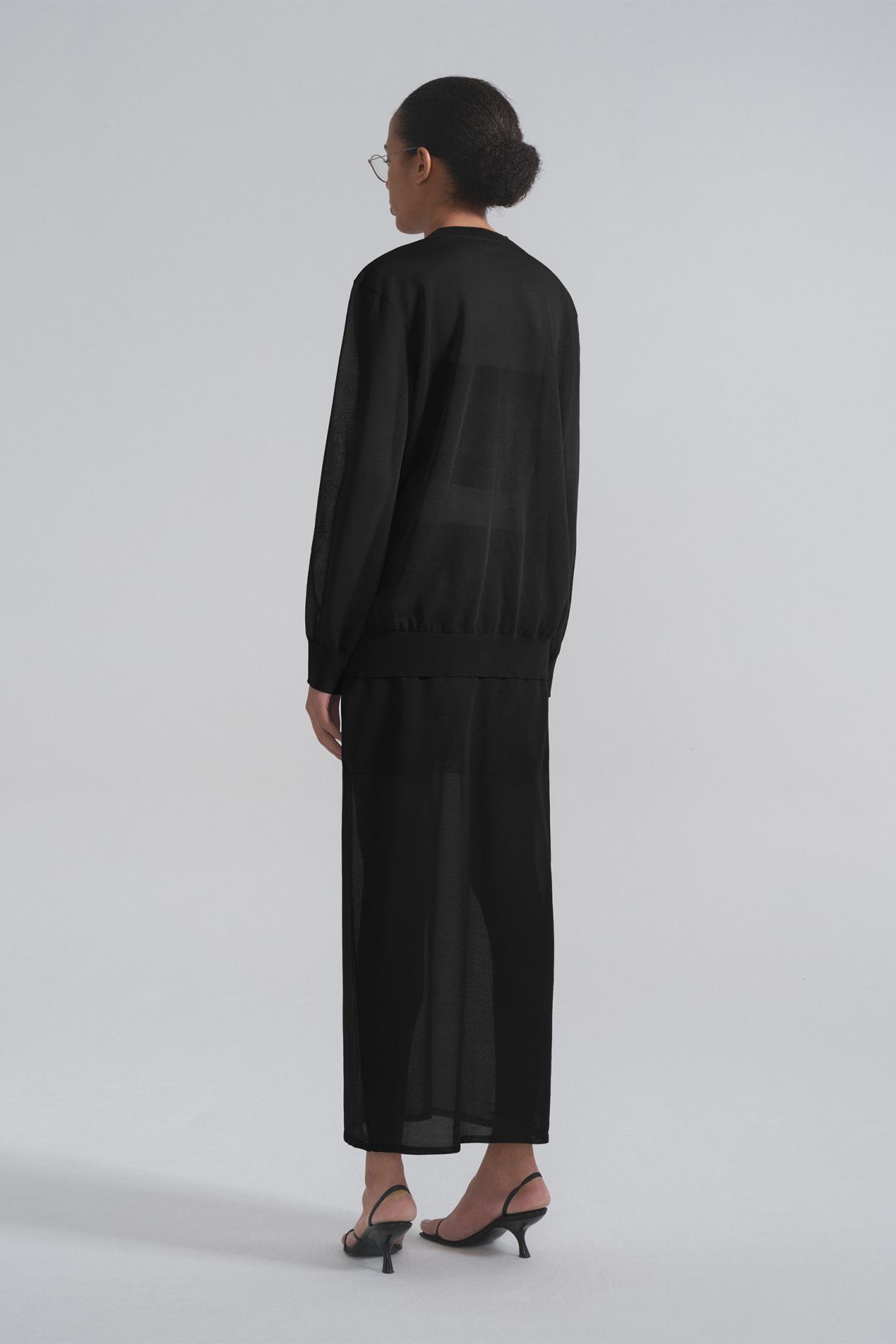 A straight transparent skirt with a slight flare at the bottom on a one-piece belt with an elastic band.Composition: 20% silk, 60% viscose, 20% nylon