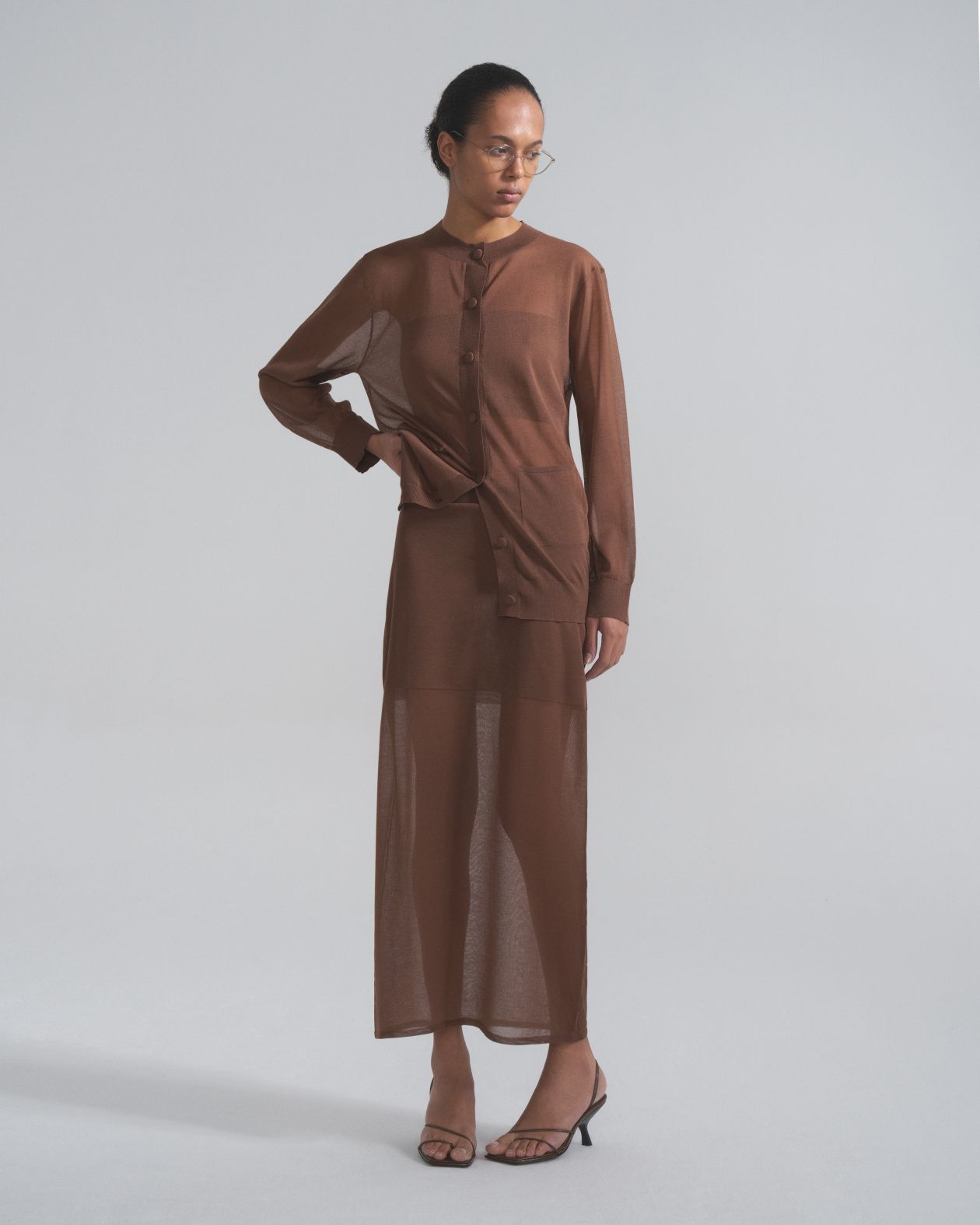 A straight transparent skirt with a slight flare at the bottom on a one-piece belt with an elastic band.Composition: 20% silk, 60% viscose, 20% nylon