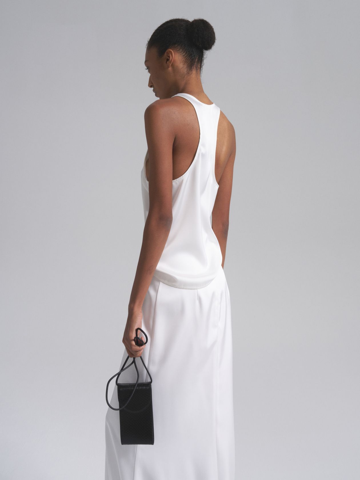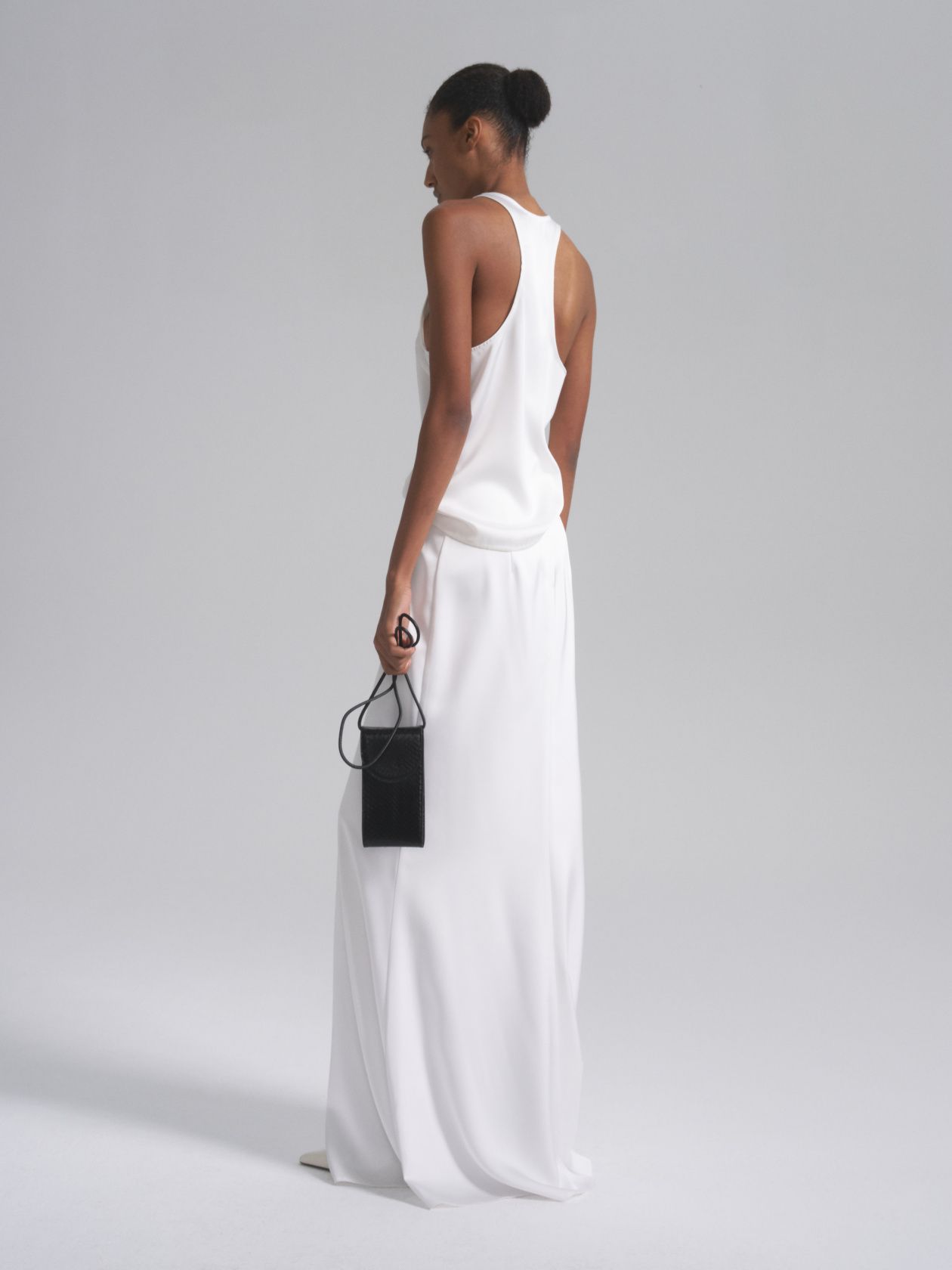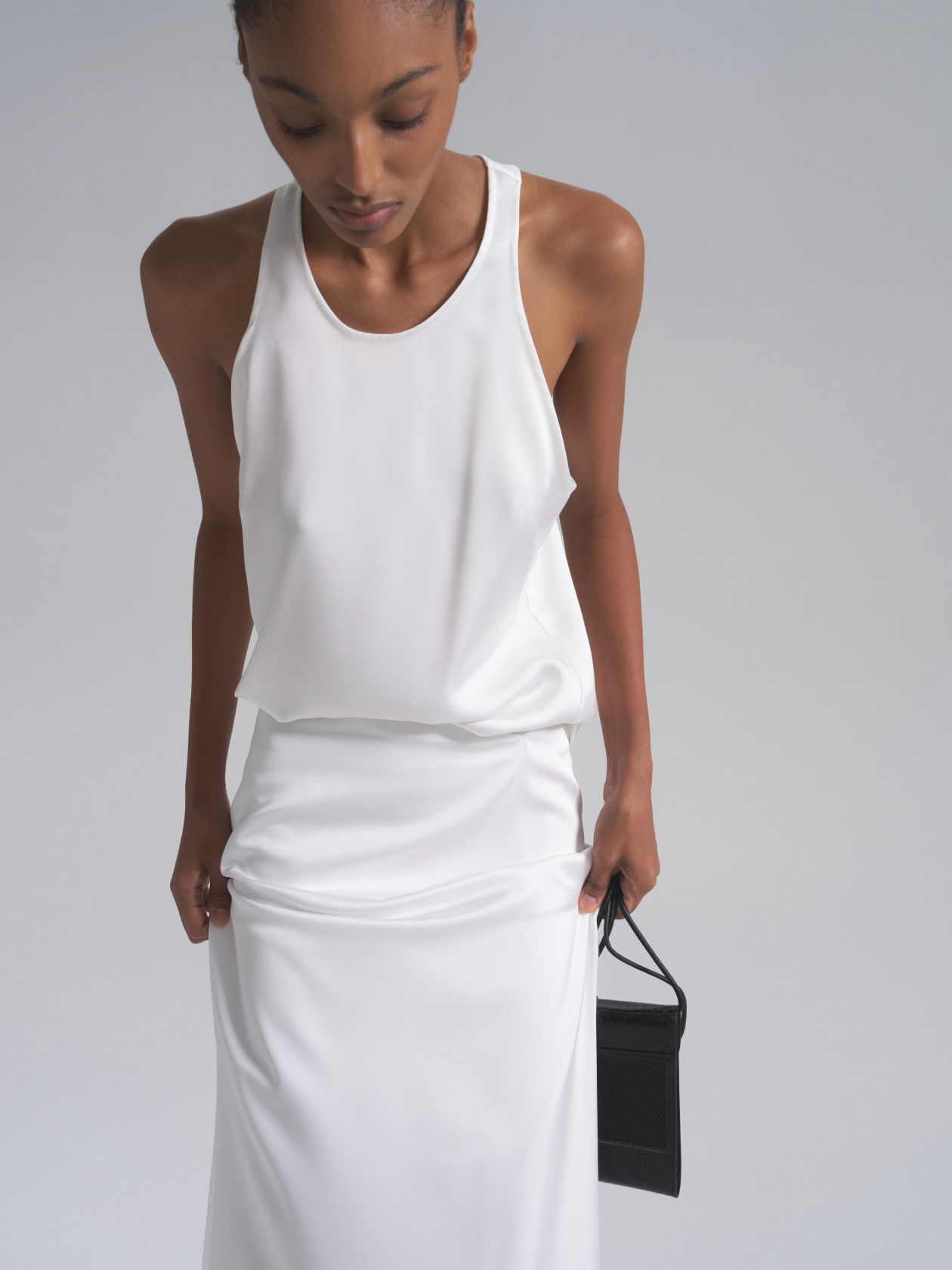 This A-line midi skirt, cut on the bias, flows gracefully as you move, gently hugging the silhouette. Crafted from dense silk and viscose, it provides softness, drape, and comfort. It's perfect not only for special occasions but also for everyday wear—perhaps paired with knitwear.