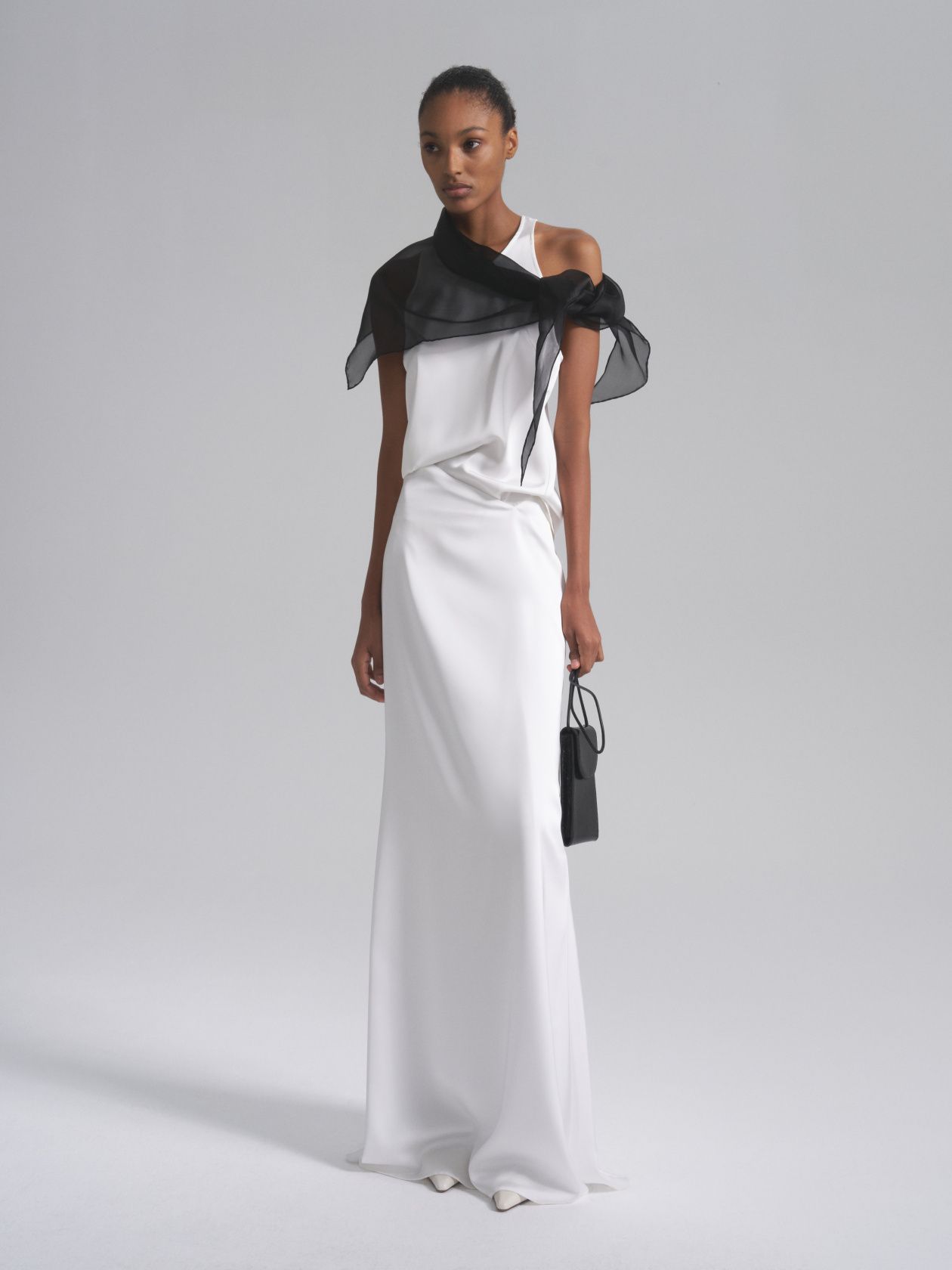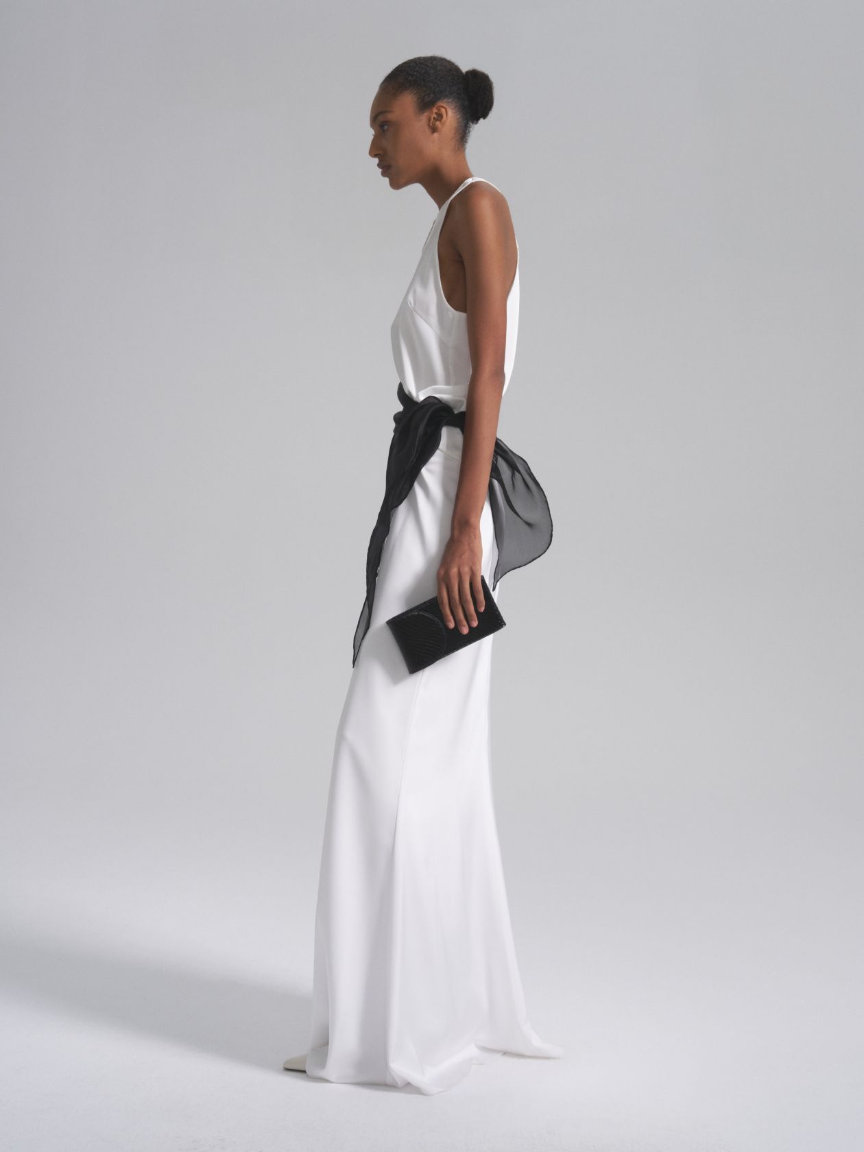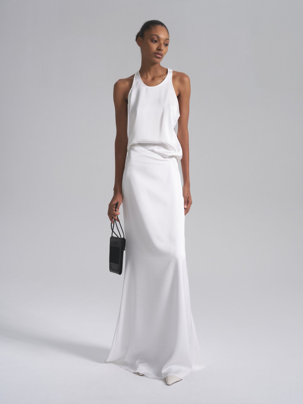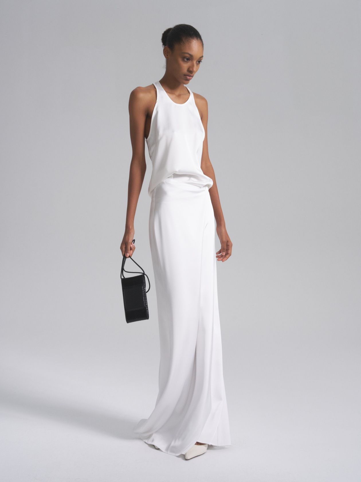 This A-line midi skirt, cut on the bias, flows gracefully as you move, gently hugging the silhouette. Crafted from dense silk and viscose, it provides softness, drape, and comfort. It's perfect not only for special occasions but also for everyday wear—perhaps paired with knitwear.