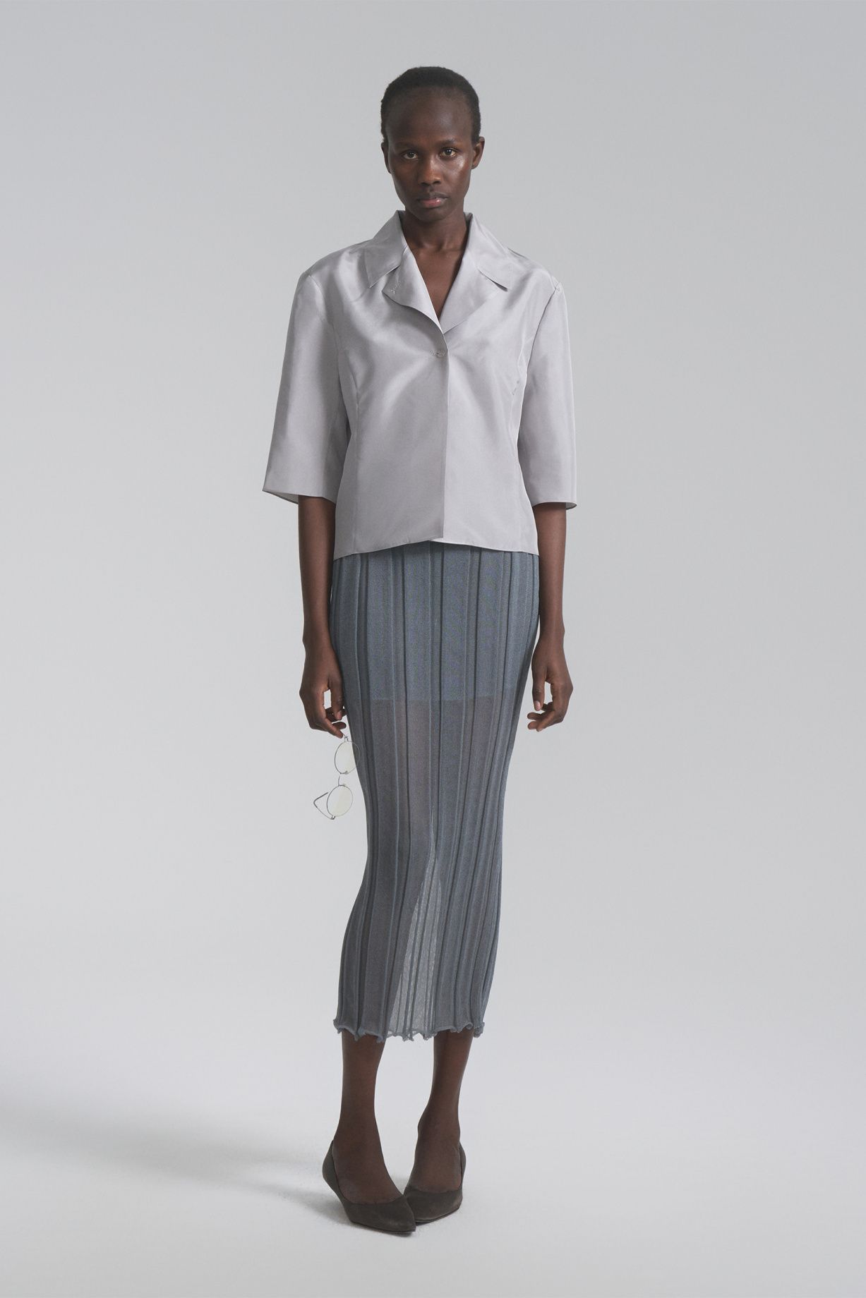 The skirt is made of weightless Italian knitwear with a slight flare in a large rib, with a denser knit on the thigh line and an elastic band at the waist.Composition: 100% nylon