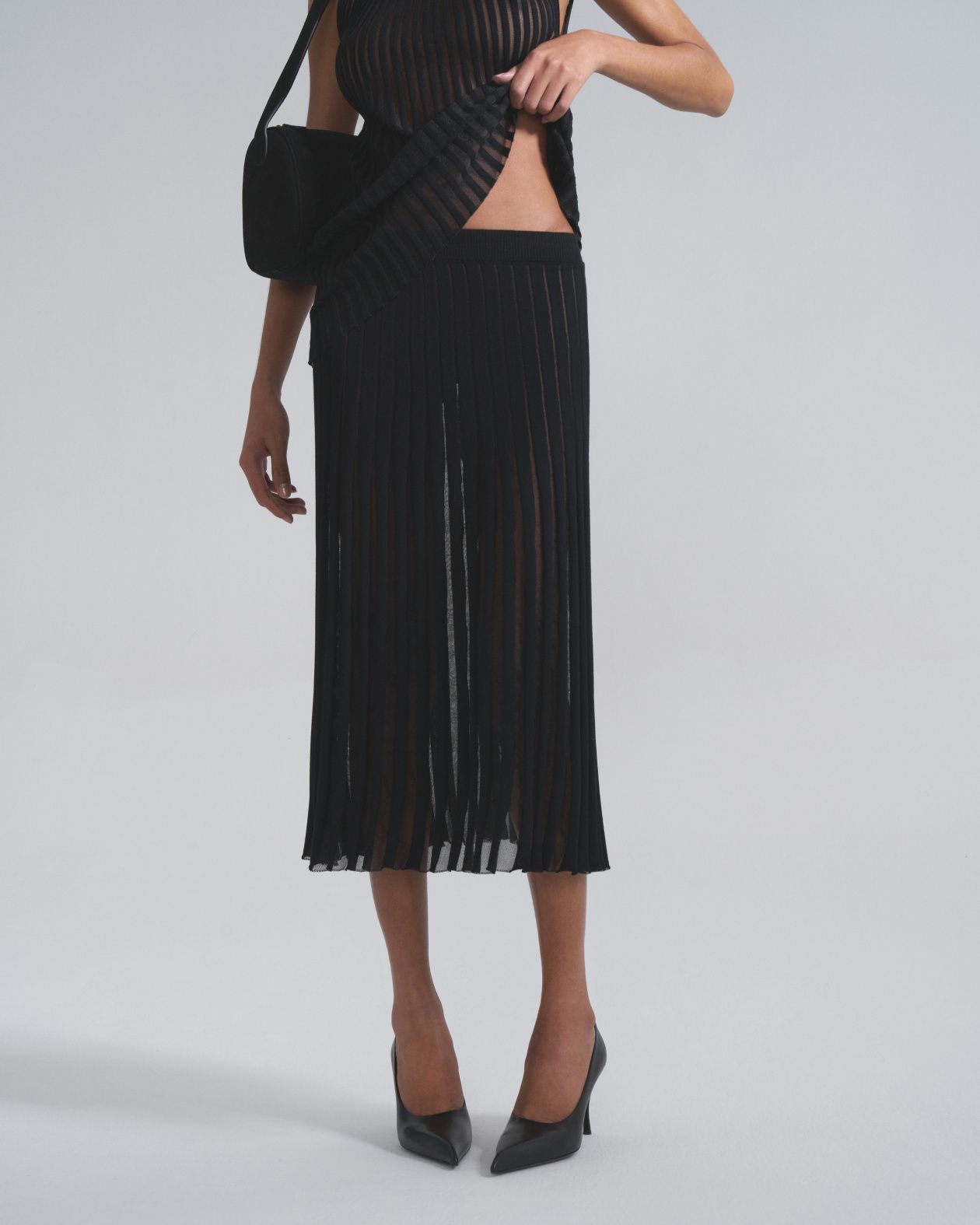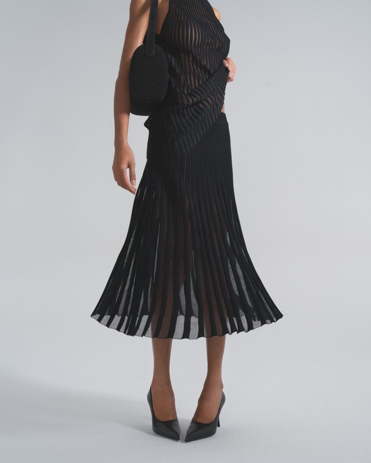 A-line skirt made of weightless premium Italian yarn, midi length, with belt. It is knitted from two types of yarn - denser in the hip area and widening downwards.Composition: 61% viscose, 30% nylon, 9% elastane