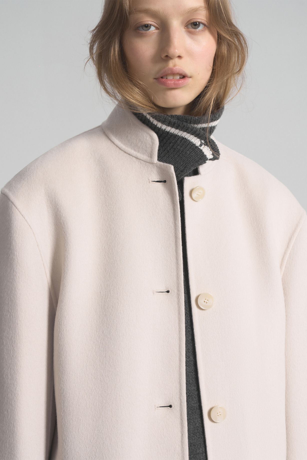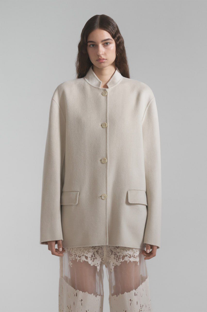 A straight-cut cashmere jacket with a stand-up collar, sewn with packed seams and complemented with horn buttonsComposition: 70% wool 30% cashmere
