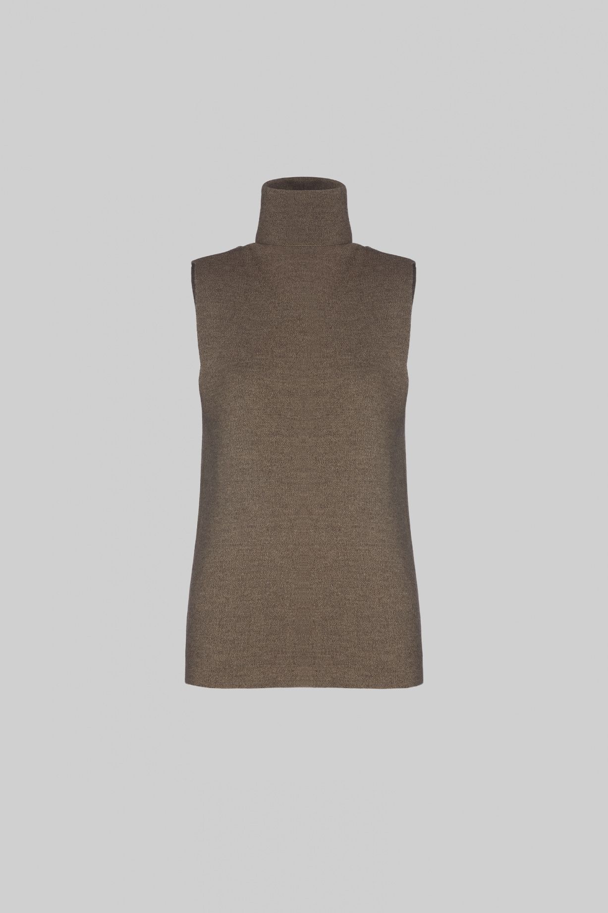 A vest with a stand-up collar, made of delicate Italian knitwear, will become a stylish and cozy addition to your wardrobe. Australian merino wool provides incredible softness and warmth, and viscose adds drapery and lightness.Composition: 60% Australian merino wool, 40% Viscose